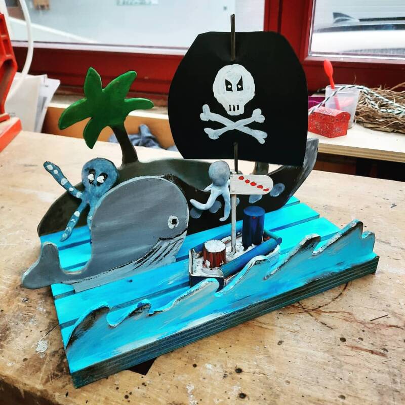 Ich habe aus Holzresten ein kleines Boot, und aus Knete einen Kraken gebastelt. Der Fantasie sind keine Grenzen gesetzt.
